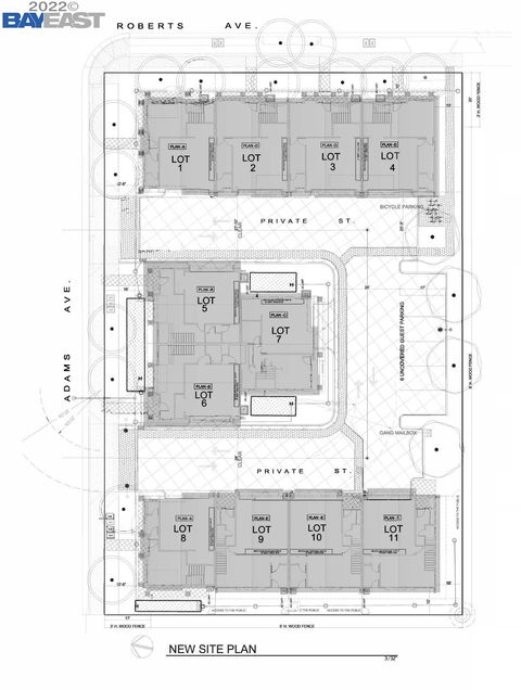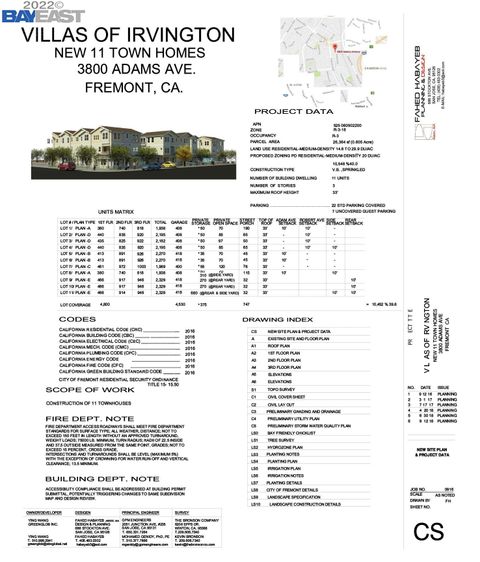 Previously approved for 11 tri-level townhomes ranging in size from 1938 sf to 2329 sf, each with 4 bedrooms, 3 bathrooms, and side-by-side 2-car garage. The development is located at the corner of Adams and Roberts, within walking distance of the Irvington Business District/Five Corners. Walk Score of 78, Bike Score of 76. Schools are Grimmer ES, Horner MS, and Irvington HS (buyer to check with Fremont Unified).